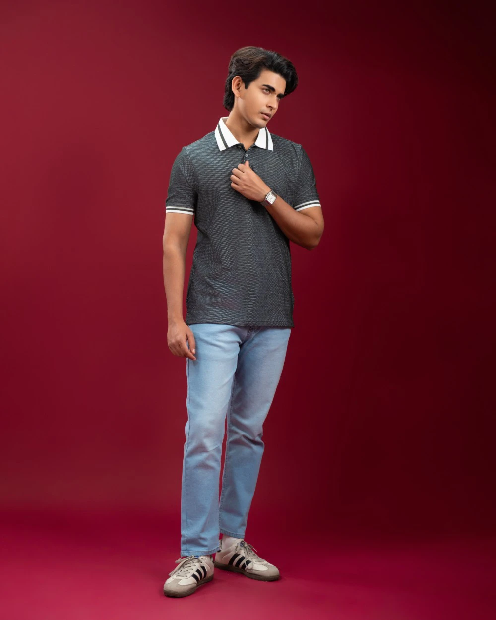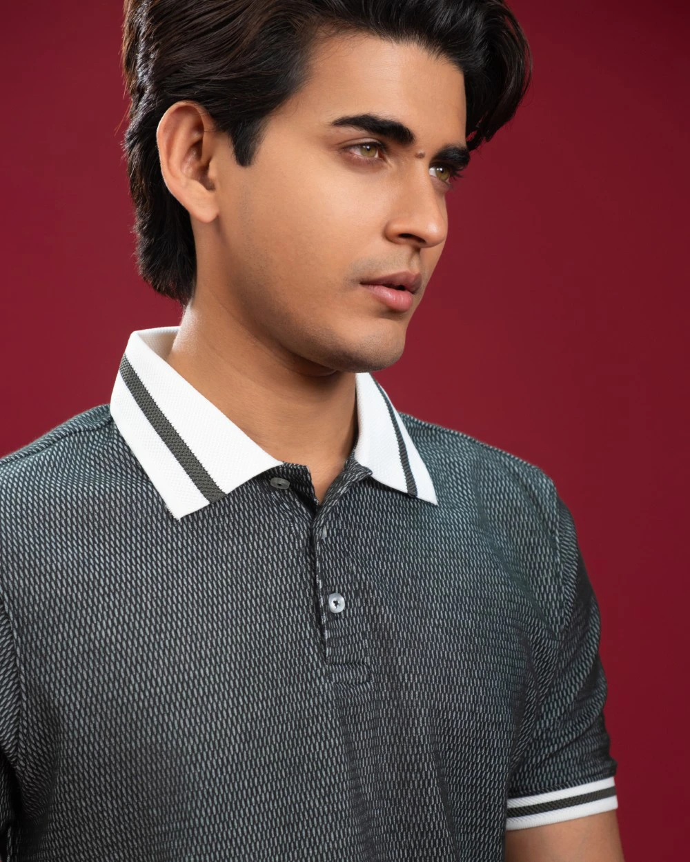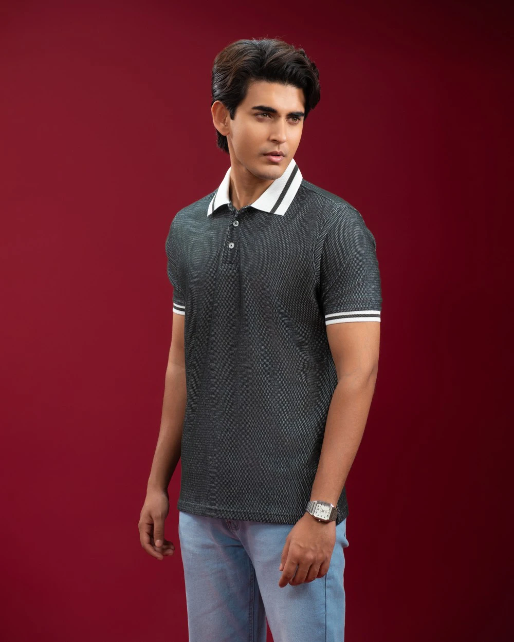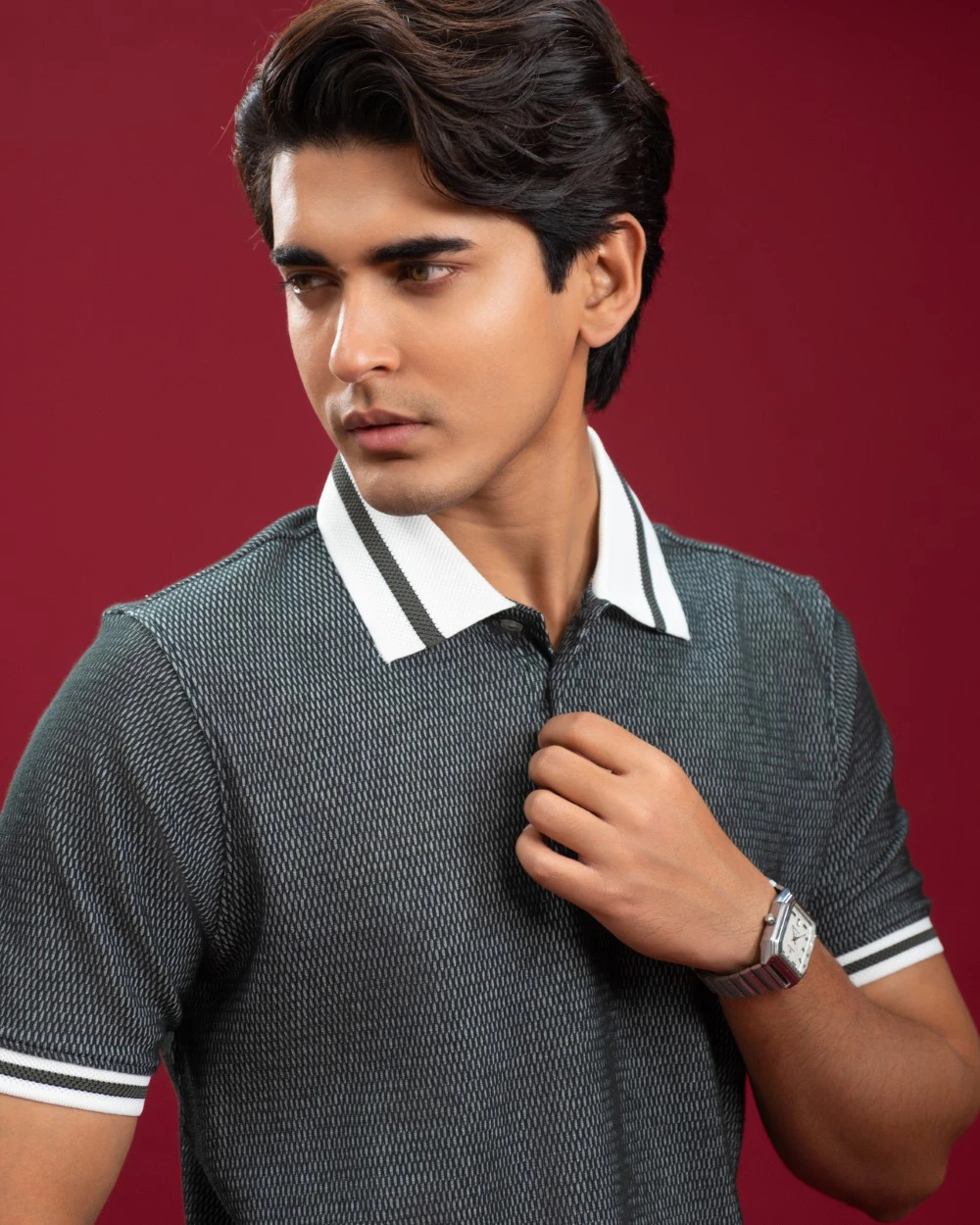 • Jacquard Ribbed Collar with Tipping: Adds a refined, premium finish