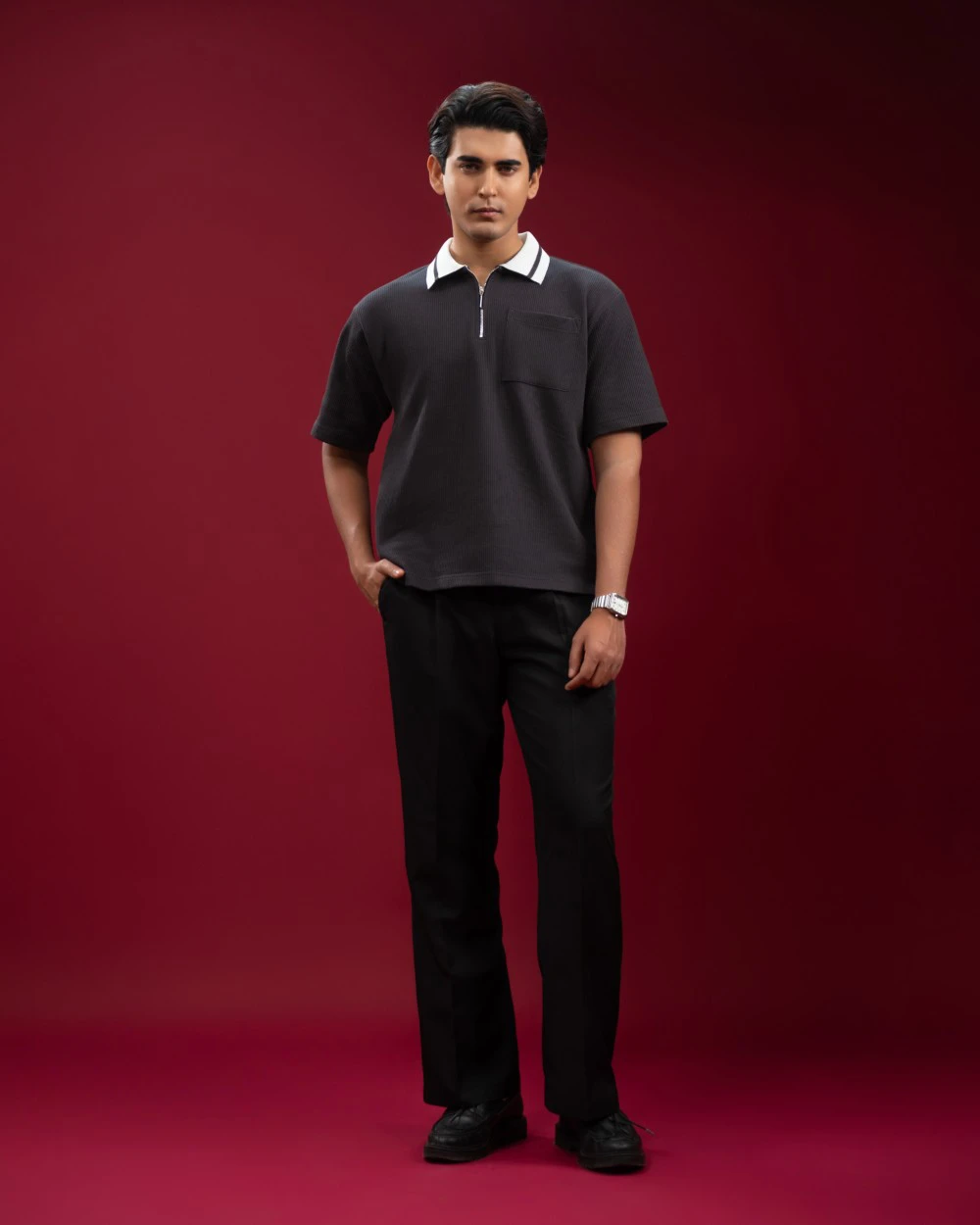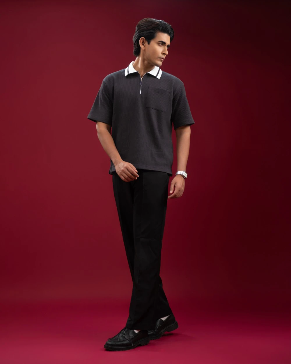 Premium cotton dobby polo, crafted using imported cotton dobby fabric (200 GSM) for superior comfort, durability, and breathability. Designed for modern men who prefer clean styling with elevated details, this zip polo blends casual comfort with smart sophistication.